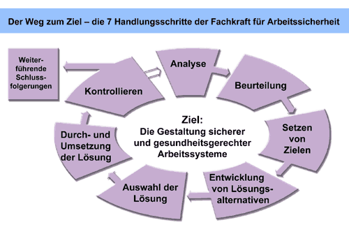 Im Rahmen unserer Tätigkeit orientieren wir uns am Handlungskreislauf der Fachkräfte für Arbeitssicherheit wie ihn die Berufsgenossenschaften lehren.